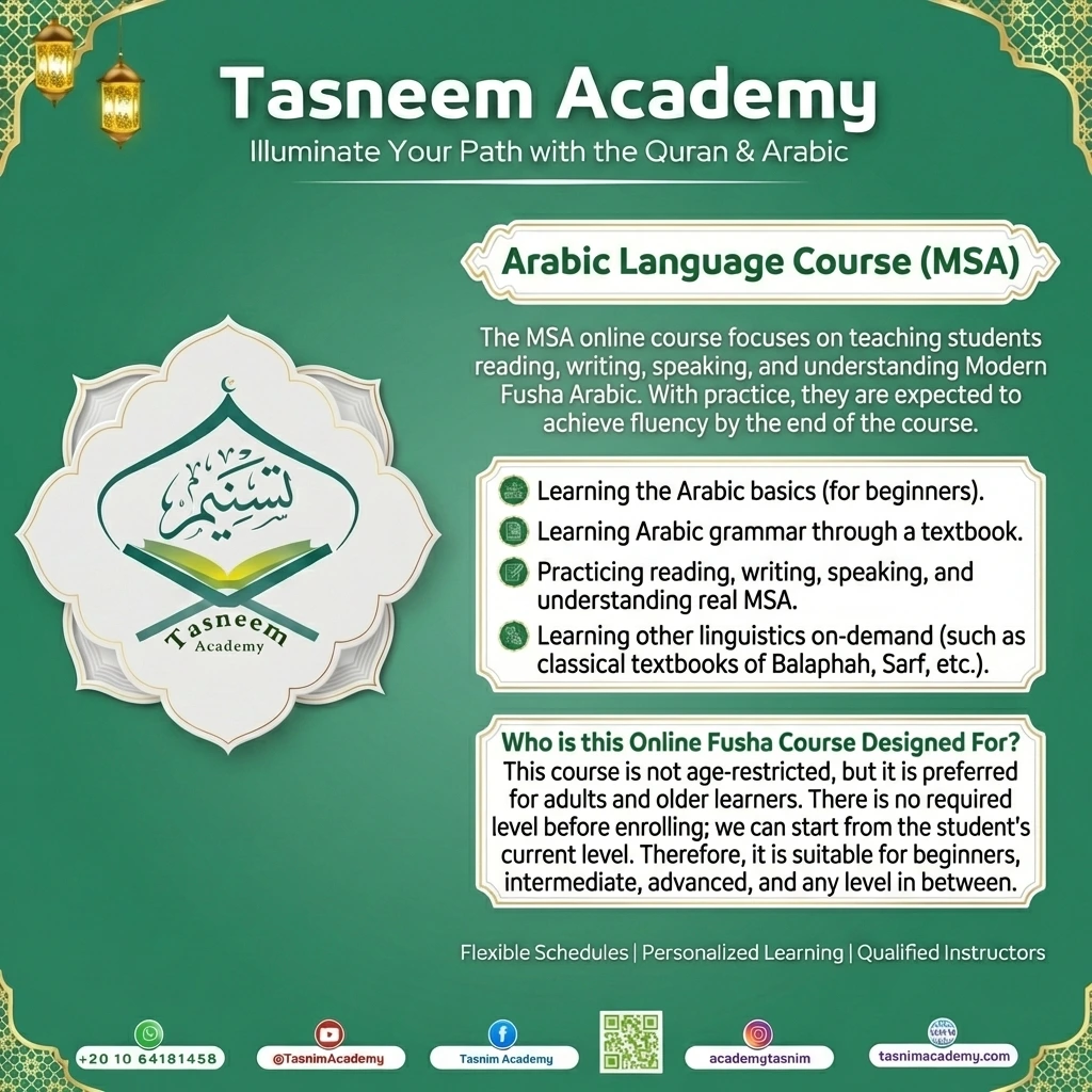 The MSA online Course focuses on teaching students reading, writing, speaking, and understanding Modern Fusha Arabic. With practice, they are expected at the end of the course to reach fluency.